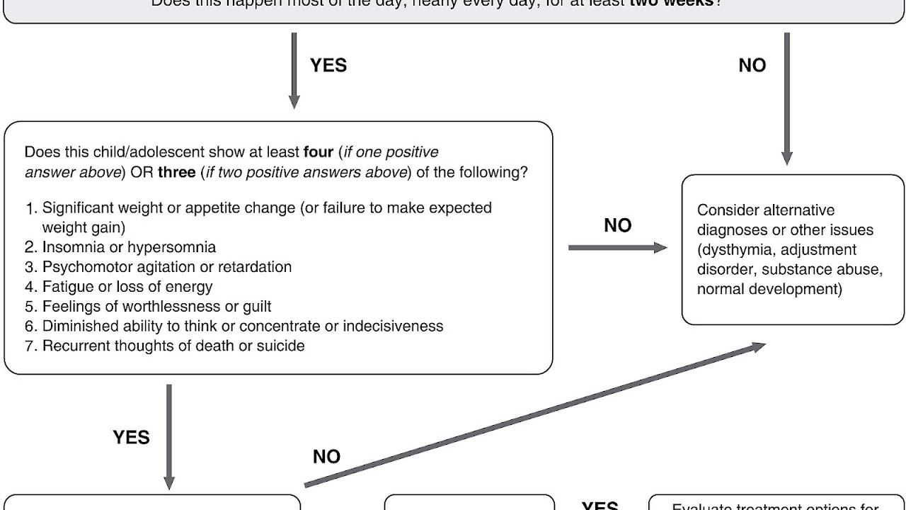 The criteria below are based on the formal DSM-IV criteria for a major depressive episode. A diagnosis of major depressive episode requires that the patient has--over a two-week period--experienced five or more of the symptoms below, and these must be outside the patient's normal behaviour. Either depressed mood or decreased interest or pleasure must be one of the five (although both are frequently present).
